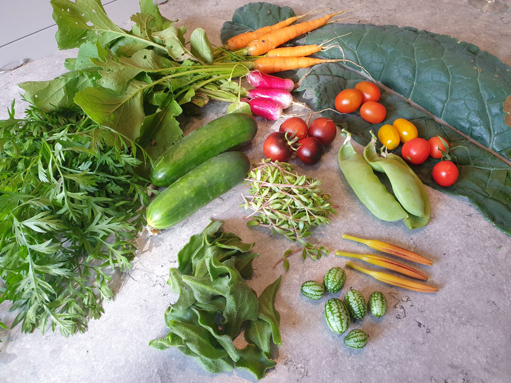 1. Perenna grönsaker som fjällsyra, Ullungloka, sockerrot, svartrot, pimpinell ‘Salad Burnet’ med flera samt spontansådd dill.