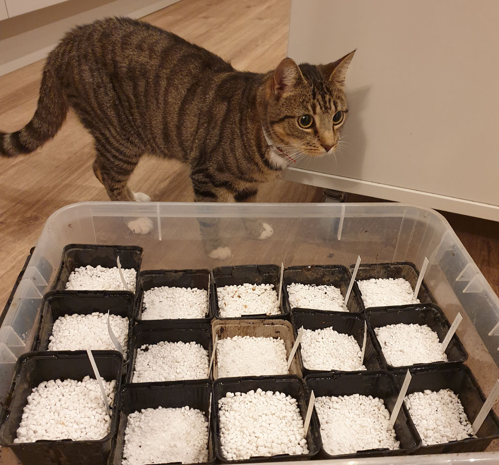 I de tre stora runda baljorna blir det därför samodling i år. Sockerärt ‘Lokförare Bergfälts jätteärt’, tomat ‘Wapsipinicon’, ‘Cherny Mavr’ och Zolotoy Potek’, paprikorna ‘Ferenc Tender’, ‘Hungarian Buldog’ och ‘Candy Cane Love Chocolate’. Den sistnämnda blir i sommar F4-generation. Jag fortsätter att odla den för att till slut få fram rent frö och bli kvitt F1-problemet. Just den här sorten är så snygg med variegerat bladverk och randiga paprikor att jag ändå vill försöka. Ska också klämma in några basilikaplantor av ‘Genovese’ och ‘Gustosa’ i baljorna. Planen är att sockerärtorna som sås tidigt ska ha gett klart på högsommaren, lagom till att tomaterna behöver mer plats. Vi får se hur det går.