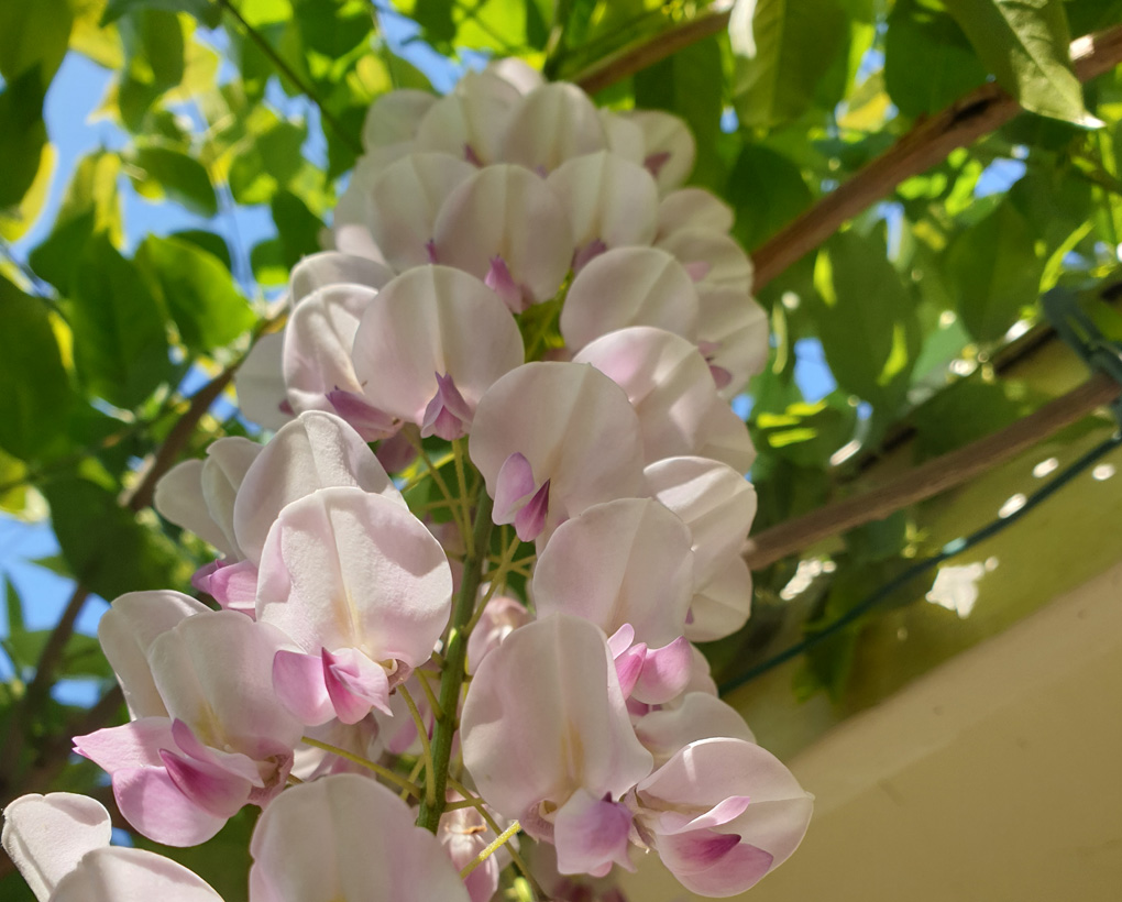 Vid den varma söderväggen bredvid poolen blir det även i år stora tomater, men bara ‘White Wonder’ och ‘Cornue des Andes’. Tomaterna samodlas med hjälmböna, tagetes och basilika. Hjälmbönan var en besvikelse 2024 då den på grund av den svala sommaren bara orkade blomma sent på hösten, precis innan frosten kom. Men odlarvänner har lyckats med den, så jag ger den ett nytt försök på ännu varmare plats. Hjälmbönans blommor, blad och bönskidor kan alla ätas (vissa efter upphettning). Sök på lab lab och hitta en spännande grönsak!