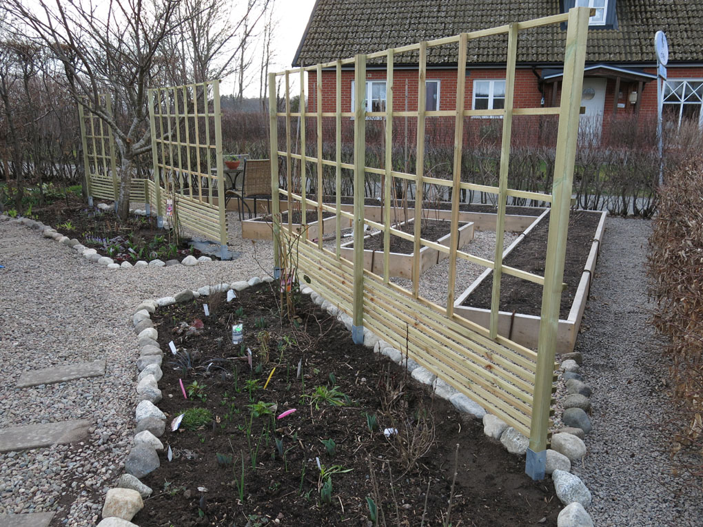 Flitig make. C har byggt färdigt spaljéerna vid Skära rabatten. Rosor och klematis ska klä in dem.