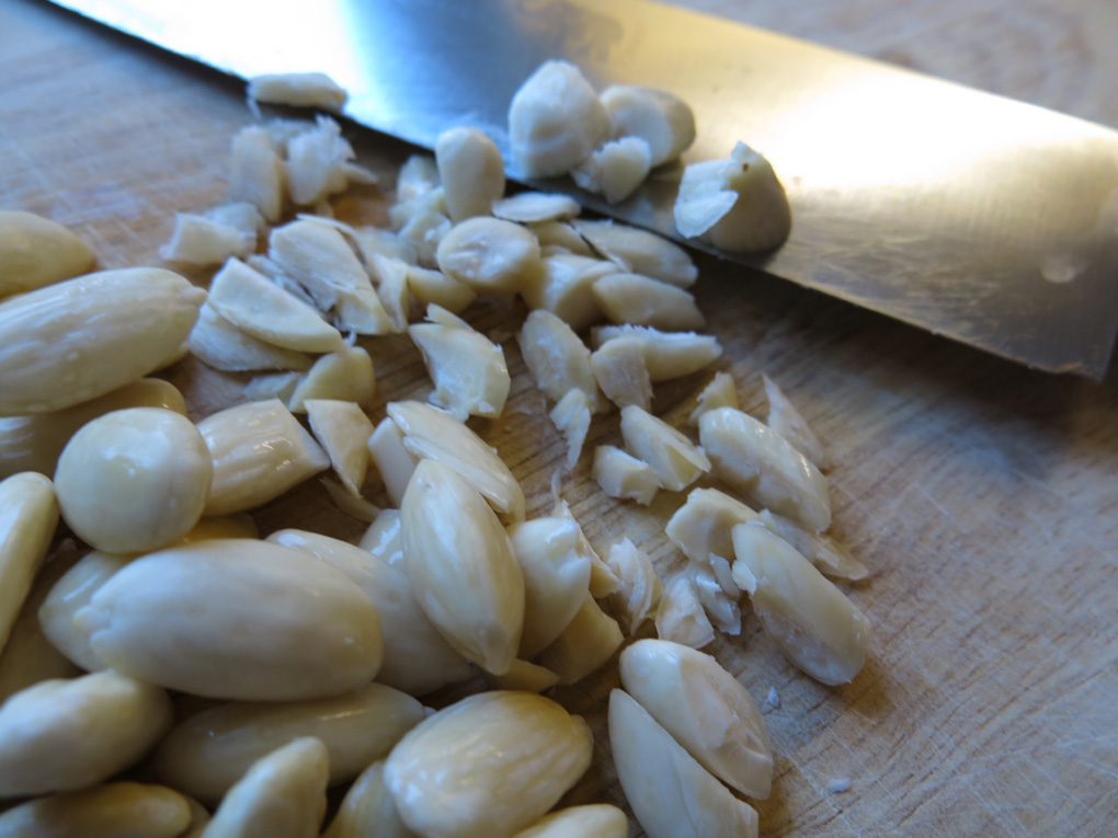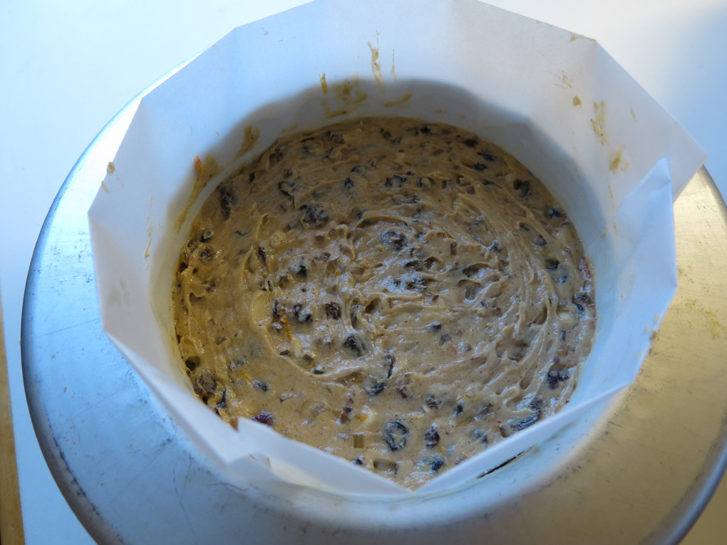 Rör sedan i frukten, mandlarna, sirapen och citrusskalen. Skeda i smeten i formen och jämna till ytan. Ovanpå formen läggs ett dubbelvikt bakplåtspapper med ett urklippt luftningshål, stort som en femkrona, i mitten.