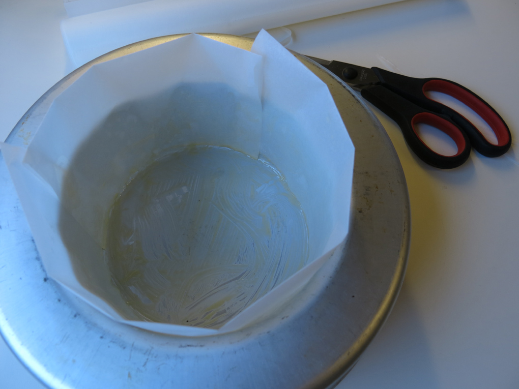 Ta fram din form, smöra insidan och klipp sedan till bakplåtspapper att täcka sidor och botten med. Helst ska man sedan smöra pappret och sätta fast ett lager papper till. Låt gärna pappret gå upp en bit ovanför kanten.
