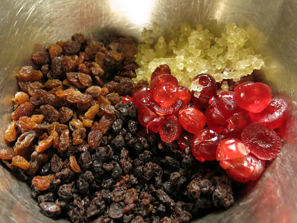Måtten inom parentes här nedan är för den lilla formen. Under åren har jag modifierat ursprungsreceptet något för att passa vår smak. Jag har valt att ha med ursprungsreceptet till vänster och min modifierade variant inom parentes, så kan ni själva se var ändringarna är och välja om ni vill göra originalet eller inte. Jag har valt att minska russinmängden något och ha lite extra körsbär och mandlar. Det går bra att anpassa innehållet så man får kakan efter egen smak, håll bara koll så vikten på den totala mängden russin och frukt blir rätt.