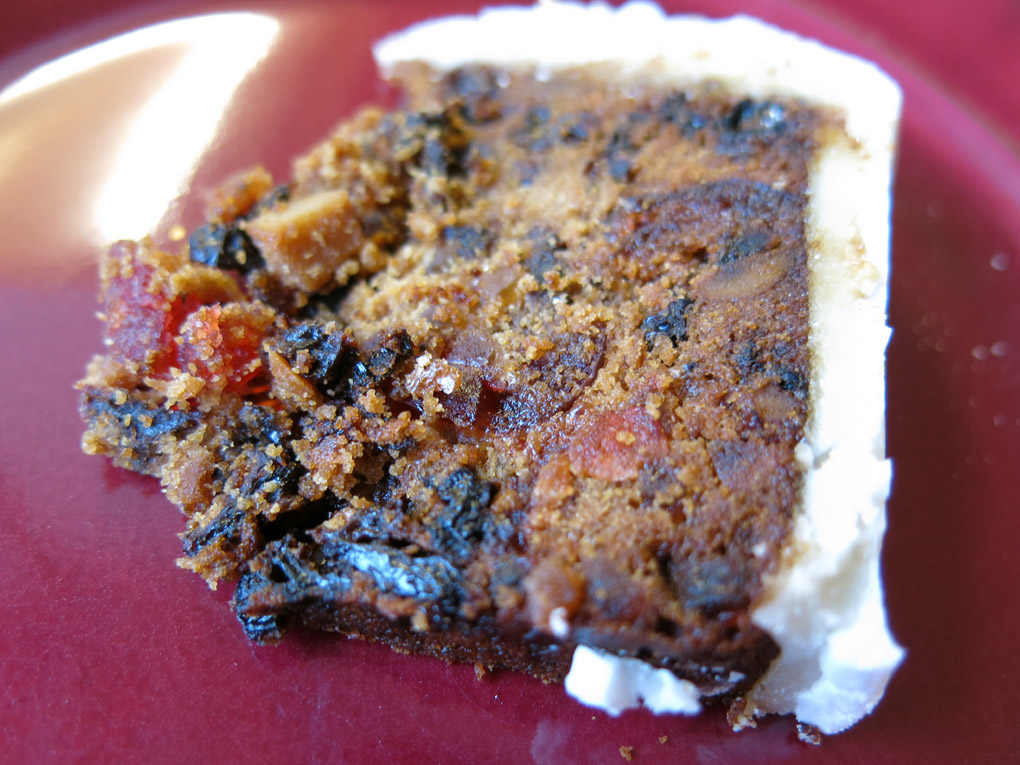 Någon dag efter det att glasyren lagts på är kakan klar att äta. Kämpade länge med att försöka skära hela skivor som höll ihop. Det går inte. När jag frågade min engelska väninna hur de gör i England, skrattade hon bara och sa att det hör till att bitarna inte är hela…