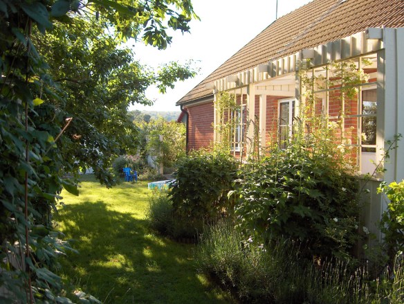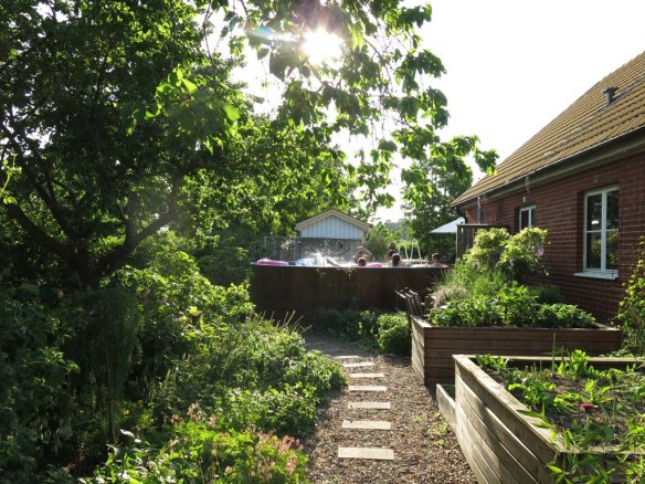 2016. Tio år senare såg det ut så här. Grusgångar, ett stor lundområde under de gamla fruktträden, upphöjda odlingsbäddar och en stor pool för tonåringarna och deras vänner.