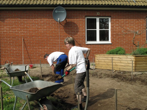 Det relativt nya trädäcket skulle byggas om och bli större = många skottkärror ut med jord och många in med sand. Barnen tjänade många extraslantar på att lasta sand i skottkärrorna medan maken och jag körde in dem i skytteltrafik och tömde…