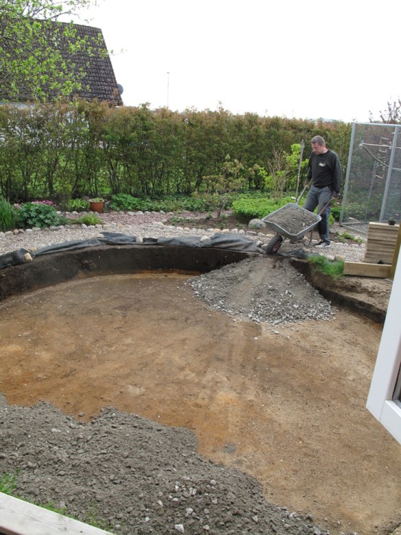 Vi slet ut åtskilliga skottkärror de närmaste åren. Eftersom vi tidigt anlade häckar gick det inte att komma in i trädgården med maskiner. All jord som skulle grävas ur för poolen grävdes och kördes ut för hand. Sedan skulle krosskrus och sättsand kärras in…