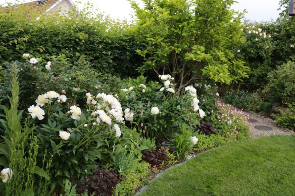 2. I öster en pionrabatt i rosa toner tillsammans med en kopparlönn och en praktmagnolia.