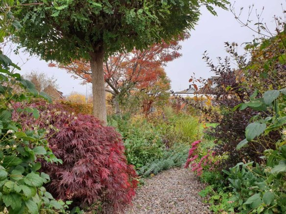 1. I söder en perenn- och rosenrabatt i gult, koppar och lila tillsammans med en rödbladig japansk lönn, en klotrobinia och en Carmencitarönn. (Numera kallad Stäpprabatten.)