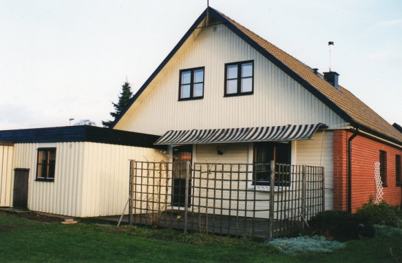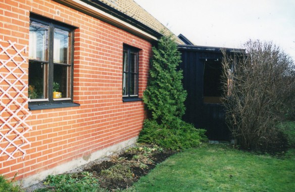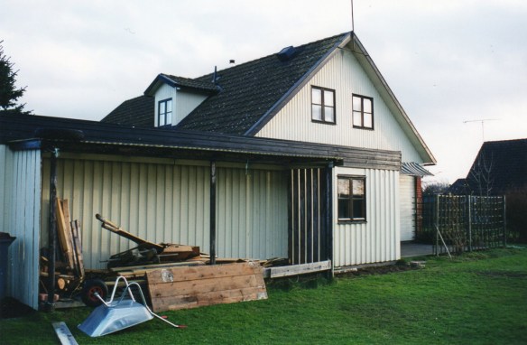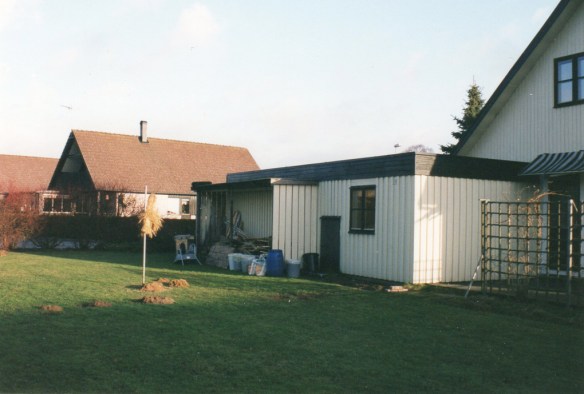Och så här såg resten av västersidan ut. Garage/varmförråd (på den tiden med fönster), gammal metalldörr till sopsäck (som redan då var utbytt mot plasttunna) och ett skräp/virkesupplag…