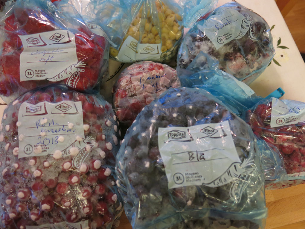 Jag väljer att frysa in alla bär som ska bli saft och sylt. Jag sköljer bären, sockrar lätt och fryser i plastpåsar noggrant märkta med sort och om det är fina bär till sylt/dekoration eller inte fullt så fina bär till saft.