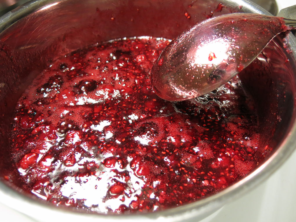 I år gjorde jag sylt på hälften aronia, hälften amerikanska blåbär, det blev riktigt bra! Aronia är ganska sträv i smaken, men uppblandat med söta blåbär blev det bra. Lite vanilj till gjorde det ännu godare. För att slippa stora bär i sylten kör jag de halvtinade bären i mixer så de slås sönder lite lagom.