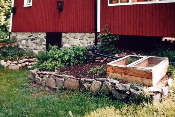Jag släpade stenar från en hög som blivit över vid renoveringen och byggde en upphöjd plantering på den sluttande tomten där jag odlade potatis, bönor och vitlök. På andra sidan dörren till stenkällaren anlade jag en liten örtagård. Bakom vedboden blev det plats för ett hallonland och en kompost.