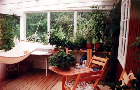 Hängmattan var en present och den var så skön att vila i inne på verandan. Längst bort i hörnet sitter min ena katt och tittar ut. Jag hade ett extra ”kattbord” där de kunde ligga i solen och ha det skönt.