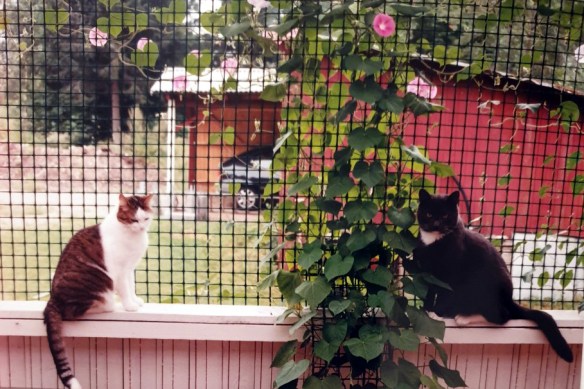 Blomman för dagen och två innekatter som fick blir verandakatter under tiden i stugan. Den grå till höger lyckades både fånga möss och fåglar inne på verandan… I bakgrunden syns carport och en vedbod som hyresvärden byggde till mig (utan att höja hyran – jag fixade ju i ordning utemiljön).