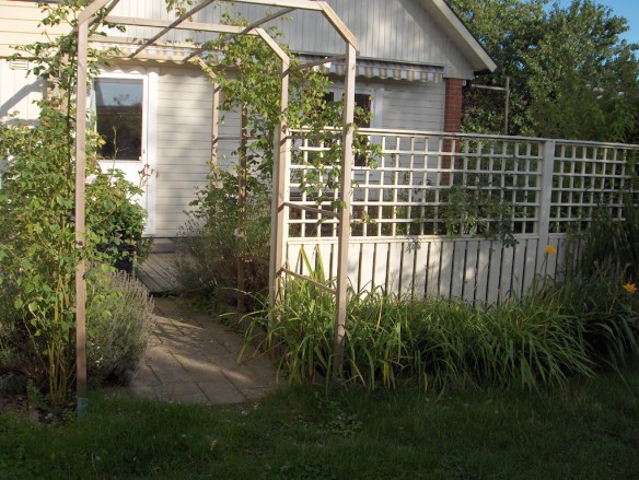 Och plankorna från trädäcket blev (bland annat) golv mellan de nya upphöjda odlingsbäddarna och ribbor i spaljén längst bort. De runda trampstenarna? De är återbruk från min mans föräldrahem. 🙂
