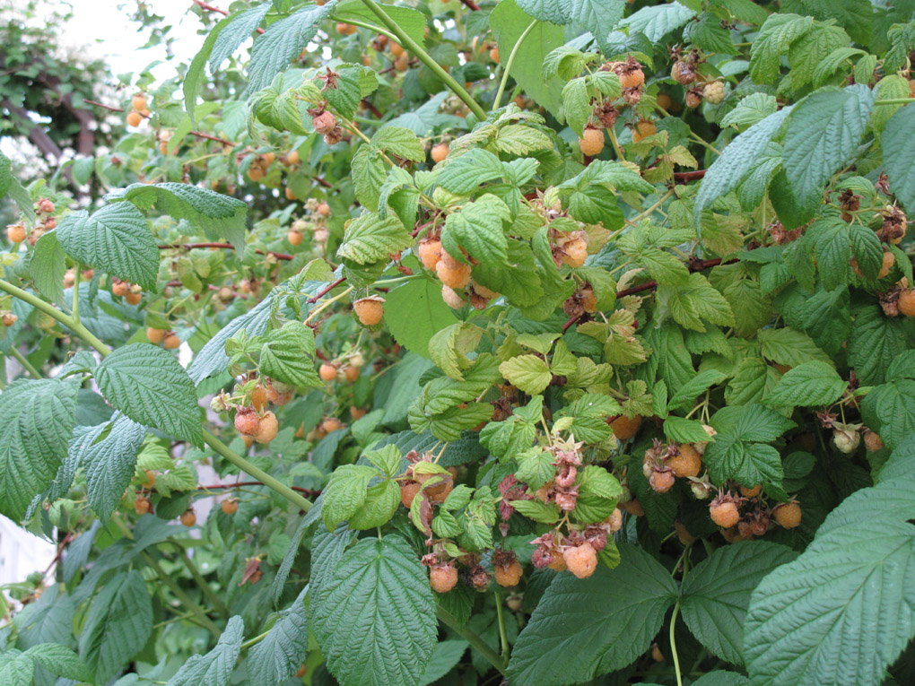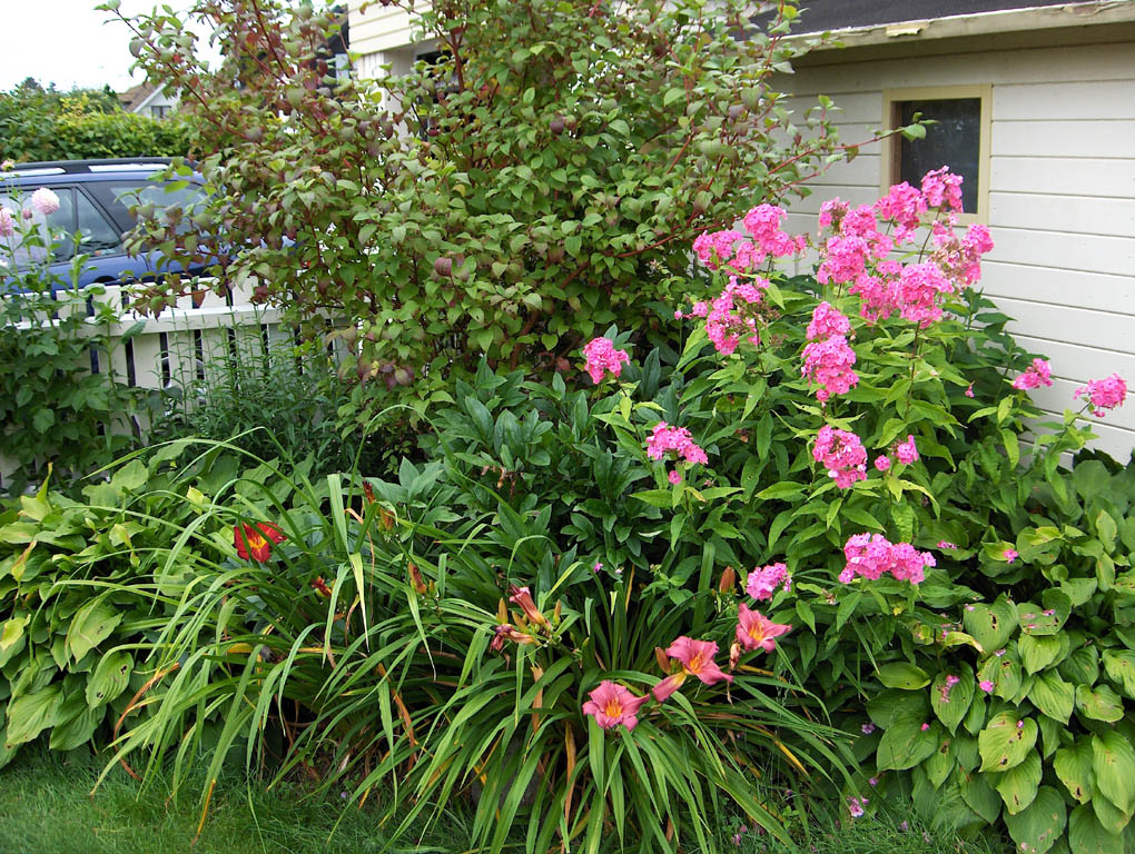 Korallkornell längst bak, sköldpaddsört, höstflox, dagliljor, drakmynta, pion, alla i olika skära nyanser och så några stora plantor med funkia. Med ett orange tegelhus skär det sig med så här kallrosa blommor framför huset, så jag har samlat dem i en och samma rabatt vid trädgårdsboden som är ljusgul.