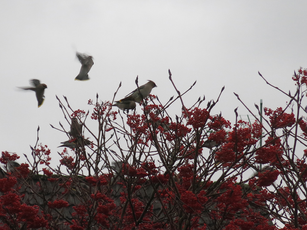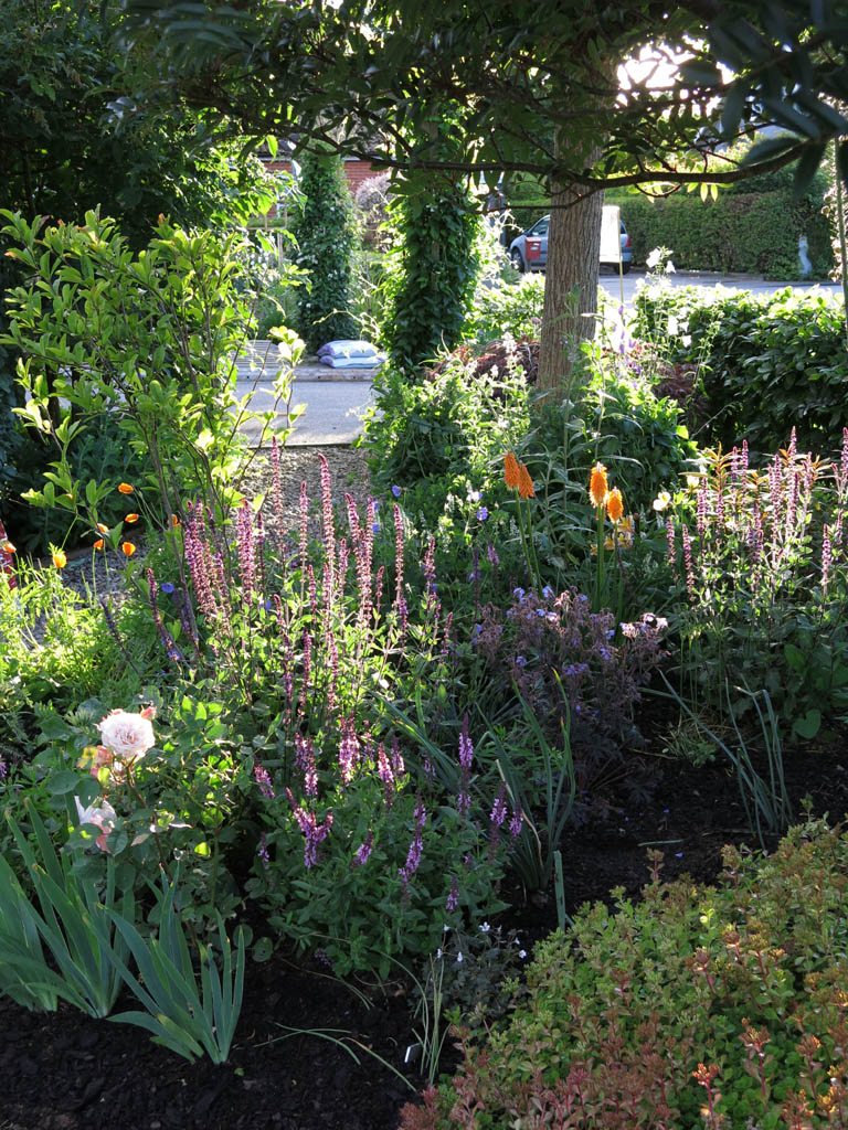 Jo, det är nästan exakt samma vinkel… Bakom fågelhuset tornar Ginnalalönnen upp sig, uppskattningsvis fem meter hög vid det här laget. Ullungrönnen ‘Dodong’ skyms inte längre av prydnadsapelbusken Malus toringo var. Sargentii E utan sträcker sig mot skyn, uppskattningsvis sex meter hög. Bredvid blommar blomsterkornellen med sina vita ”blommor”.