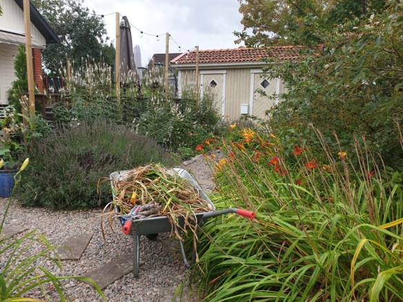 Uppröjning i den nästan överblommade dagliljerabatten. Massor av gula blad och överblommade stänglar hamnade i komposthögen.