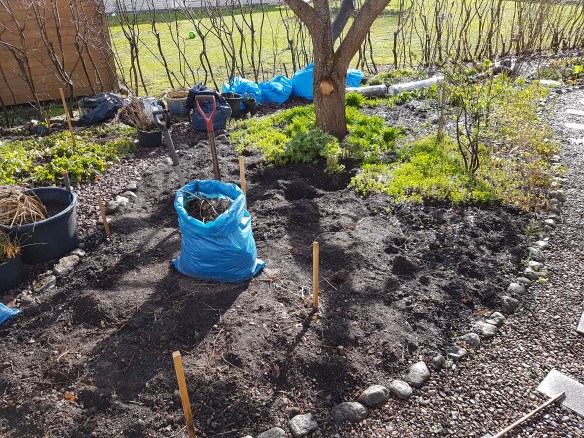 Efter. Mörkt fin jord i hela rabatten. 🙂 Allt torrt perennklipp befinner sig i den gröna säcken till vänster i bild. Har ytterligare två sådana stora lövsäckar fulla – nu när jorden är utkärrad får klippet plats i komposten.