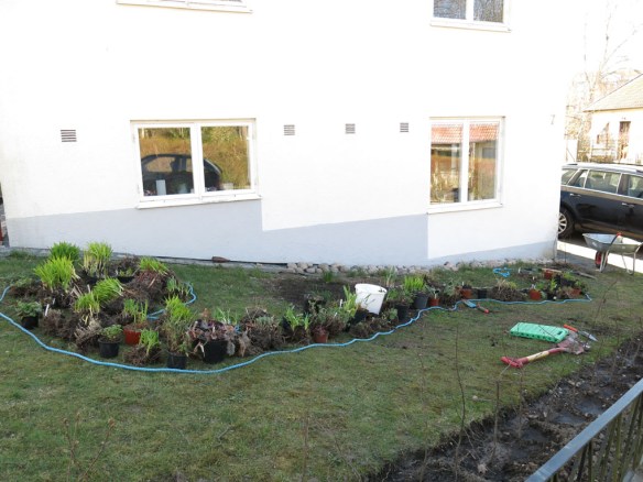 …trästammarna och lite stenar byggs nämligen in i terasserna för att förstärka lundkänslan. 217 plantor och ett hundratal tulipa ‘Tarda’ är planterade längs de två slänterna. Större plantor har planterats ner genom tidningarna. Allra närmast muren finns ett dike fyllt med småsten som grävts upp. Där är det tänkt att den jord som sköljs bort vid störtregn ska samlas så den inte sköljer ner över muren.