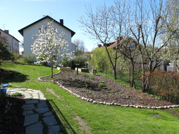 Vår 2015. Rep markerar den yta där hallon, vinbär och annat ätbart ska planteras. A har ju fler som delar med sig av växter. Till höger om den blommande magnolian står ett päronträd som inte mådde bra. I bakgrunden syns en upphöjd odlingbädd.