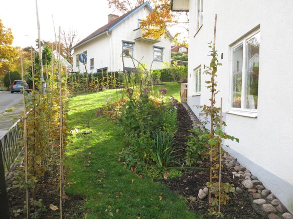 Höst 2015. Avenboken har satt rejäl fart efter ordentlig vattning och gödning. Innanför rabatten har ytan täckts med täckbark och flis så barnen kan leka där utan att bli leriga.