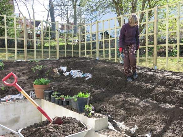 Vår 2016. En stenkant har tillkommit och i bakgrunden syns att den första upphöjda odlingsbädden fått sällskap av ännu en.