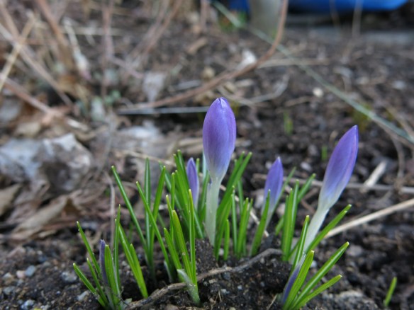 Mattan av lila snökrokus blir bara större och större för vart år. I bakgrundens syns kärleksörtens nya bladskott.