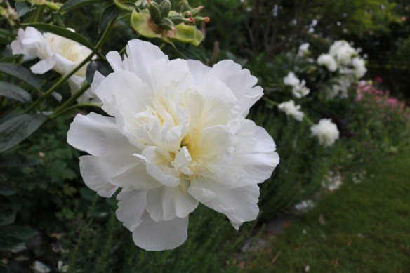 Sedan är det ju mitt i pionblomningen också. I Pionrabatten blommar det i vitt och rosa och en av favoriterna, ‘Aros Blek’, är söt som en karamell.