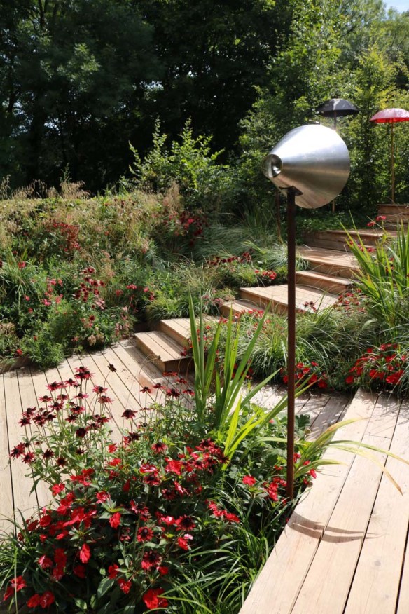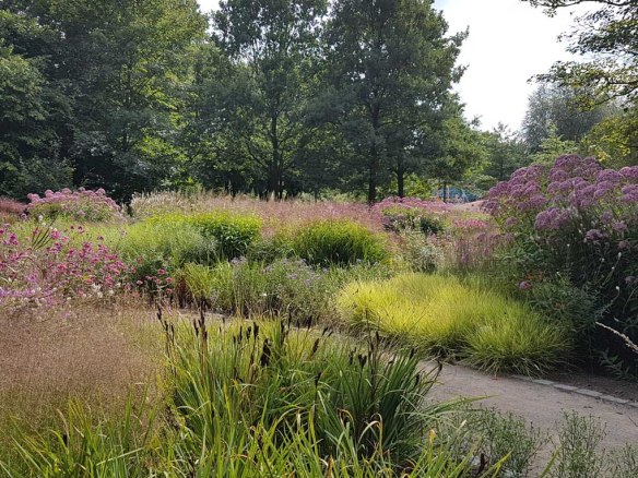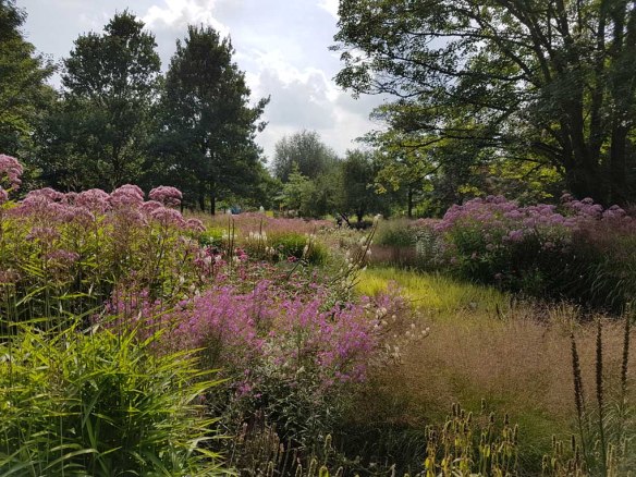 Fast brunt kan ju vara snyggt också! Som Miscanthus sinensis ‘Morning Light’ vars långa strån har eleganta böjar. I bakgrunden syns kopparlönnen, Acer griseum.