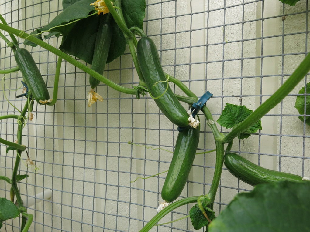 I en kruka med spaljé odlar vi också gurkan ‘Baby’ som trivts bra i skyddat västerläge. Den ska också få bilda en gurkgardin inomhus redan tidigt i vår och förlänga gurksäsongen.