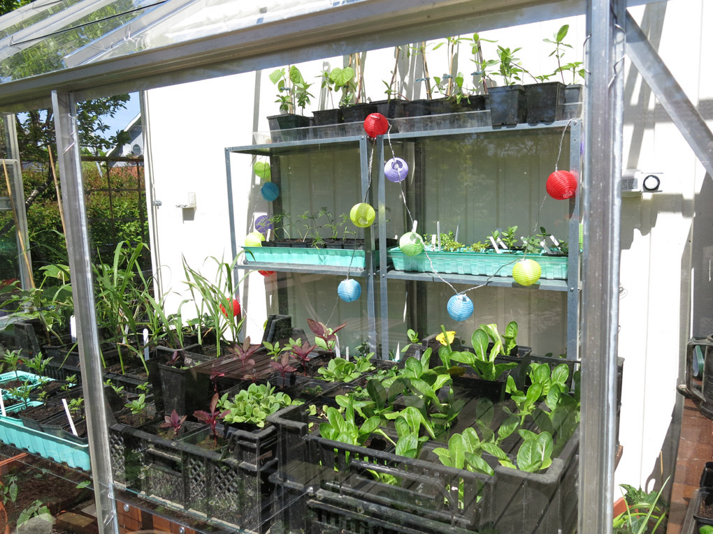 I växthuset på fem kvadrat i sydvästläge blir det som vanligt högväxta körsbärstomater underplanterade med sallat. Årets tomatsorter blir: ‘Cheerio’, ‘Black Sweet Cherry’, ‘Fransk gul’, ‘Mei Wei’, ‘Indigo cherry drops’ och nykomlingen ‘Amethyst cream cherry’. Ska också odla melon ‘Sweet Granite’ som jag testade förra året. Den gav två små meloner, trots den svala försommaren, och de var riktigt goda.