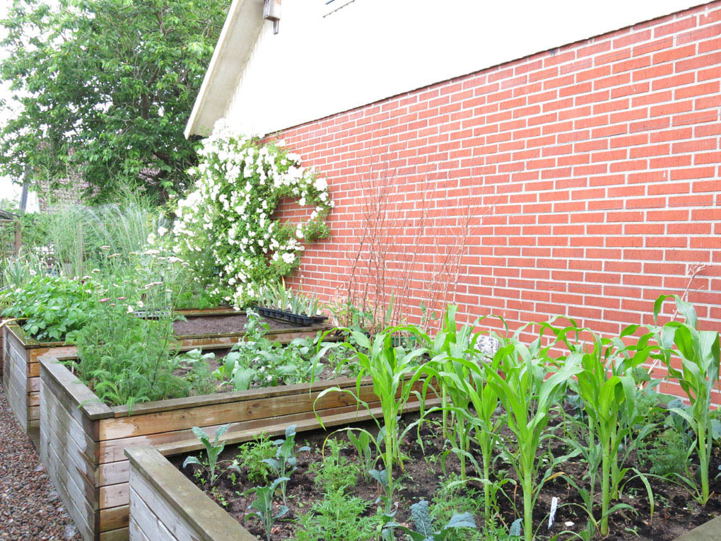 På husets östersida, i de fyra upphöjda odlingsbäddarna (som vardera är på fyra kvadrat) blir det:
