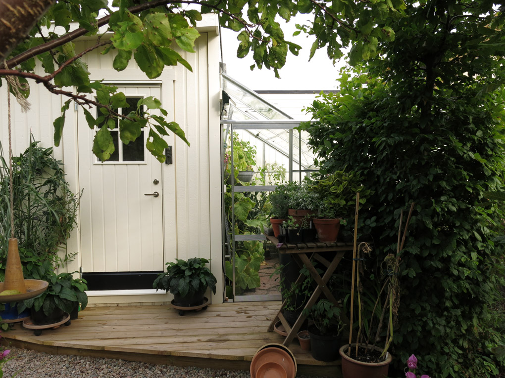 Utanför trädgårdsrummet, barnens före detta lekstuga, har jag en stor kruka med klätterställning i. Där trivs störböna ‘Neckargold’ och den får i år sällskap med sockerärt ‘Lokförare Bergfälts jätteärt’ (sådda senare än de som samodlas med tomaterna).