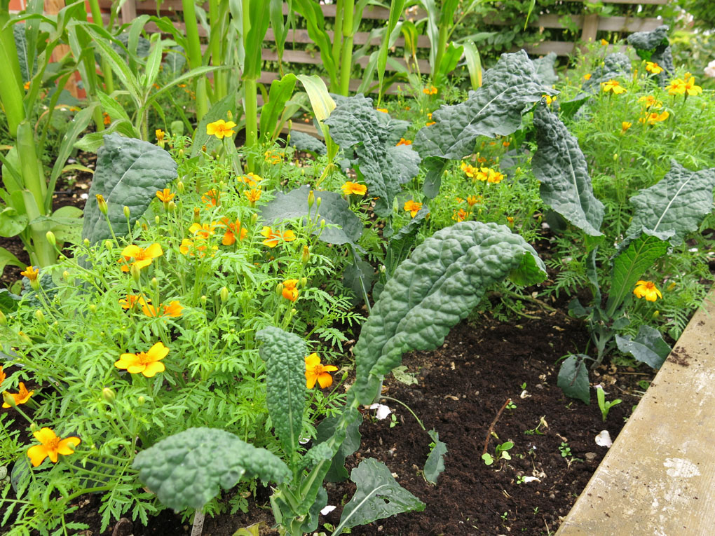 3. Kållandet består i år av perenn grönkål, majrova ‘Snöboll’, kålrabbi ‘Delikatess Blauer’, rotselleri ‘Mars’ och så ska jag testa brysselkål igen, sort oklar. Kålen får sällskap av linaria ‘Northern Lights’ och Linnétagetes. Dessa olika grödor sås lite olika tid och överlappar delvis.