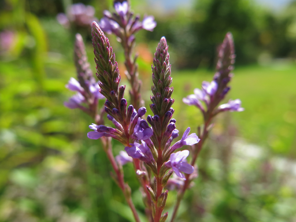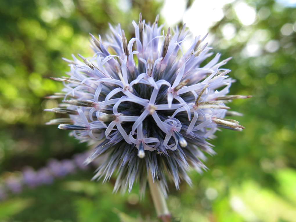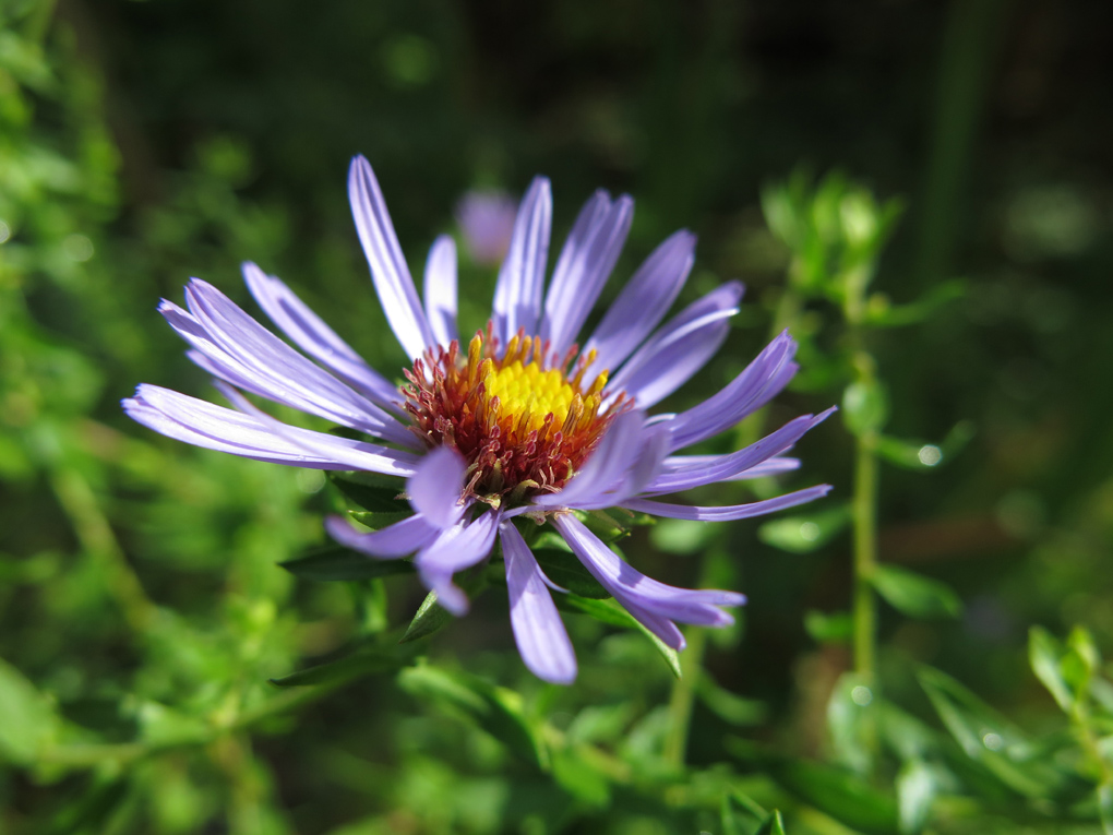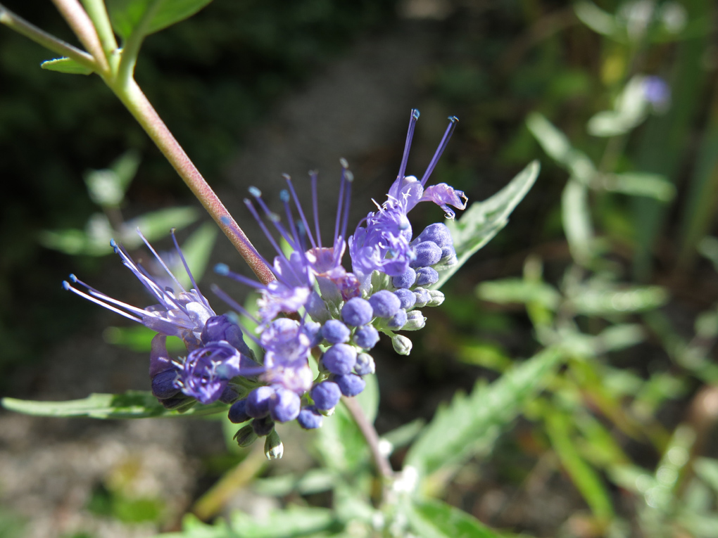 I Stäpprabatten ackompanjerar höstaster ‘October Skies’, blodtopp och skäggbuske ‘Heavenly Blue’ färgerna.