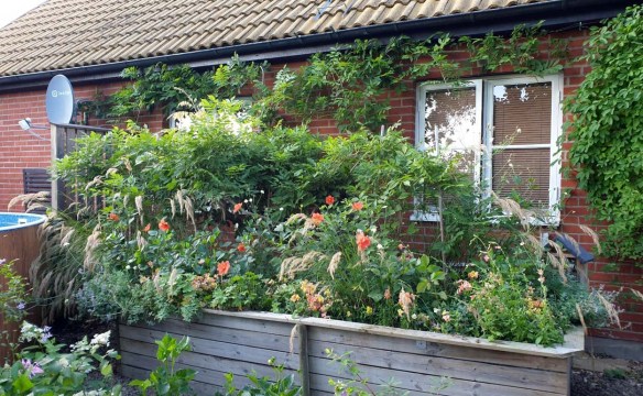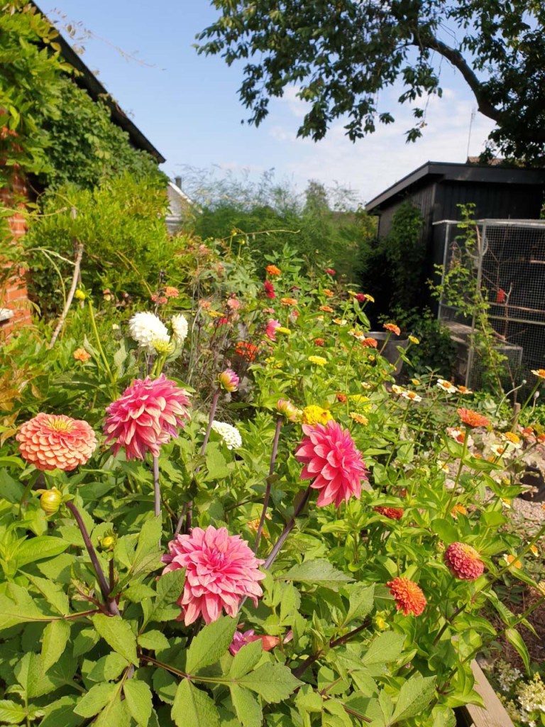 I den upphöjda rabatten bredvid samsas dahlior med rosenskära. Dahliorna växer sig stora och kraftiga utan att sniglarna kommer åt dem. På andra sidan skymtar de upphöjda bäddarna med sparris och mellan dem finns en liten sittplats.