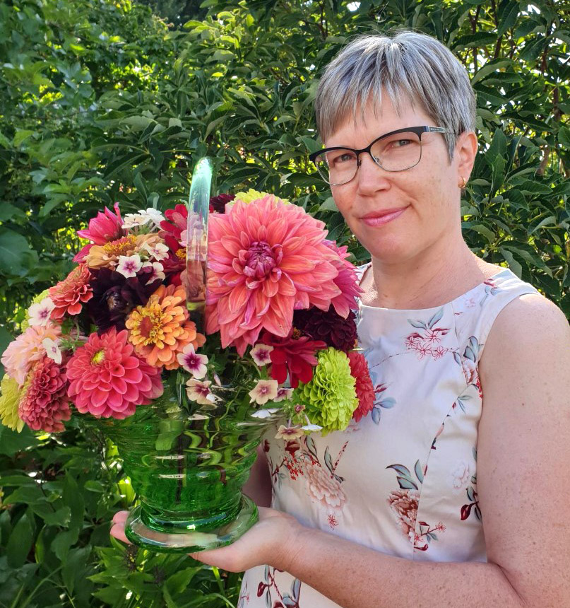 Det här är zinnian ‘Zinderella Peach’ och i bakgrunden syns ett matchande lejongap.Zinnian ‘Green Apple’ är härligt limegrön och humlorna gillar den skarpt.Dahlian ‘Karma Choc’ fick jag aldrig se förra året för sniglarnas mumsande, men i år blommar den fint.‘Jowey Nicky’ är en av de många nya dahliorna.‘Dark Spirit’, mer svartröd i verkligheten, blir lite för röd på bild.‘American Dawn’ är läckert rosaaprikosskär.Och den här är jag helförtjust i! ‘Waltzing Mathilda’ heter den. Måste upplevas, en blandning av så många olika nyanser orange och skärt. Borde inte funka ihop, men det gör det.Så här kan det bli i en bukett! Fyndade den stora fina glaskorgen på loppis tidigare i somras och inför de stundande åskregnen fyllde jag den med blommor.