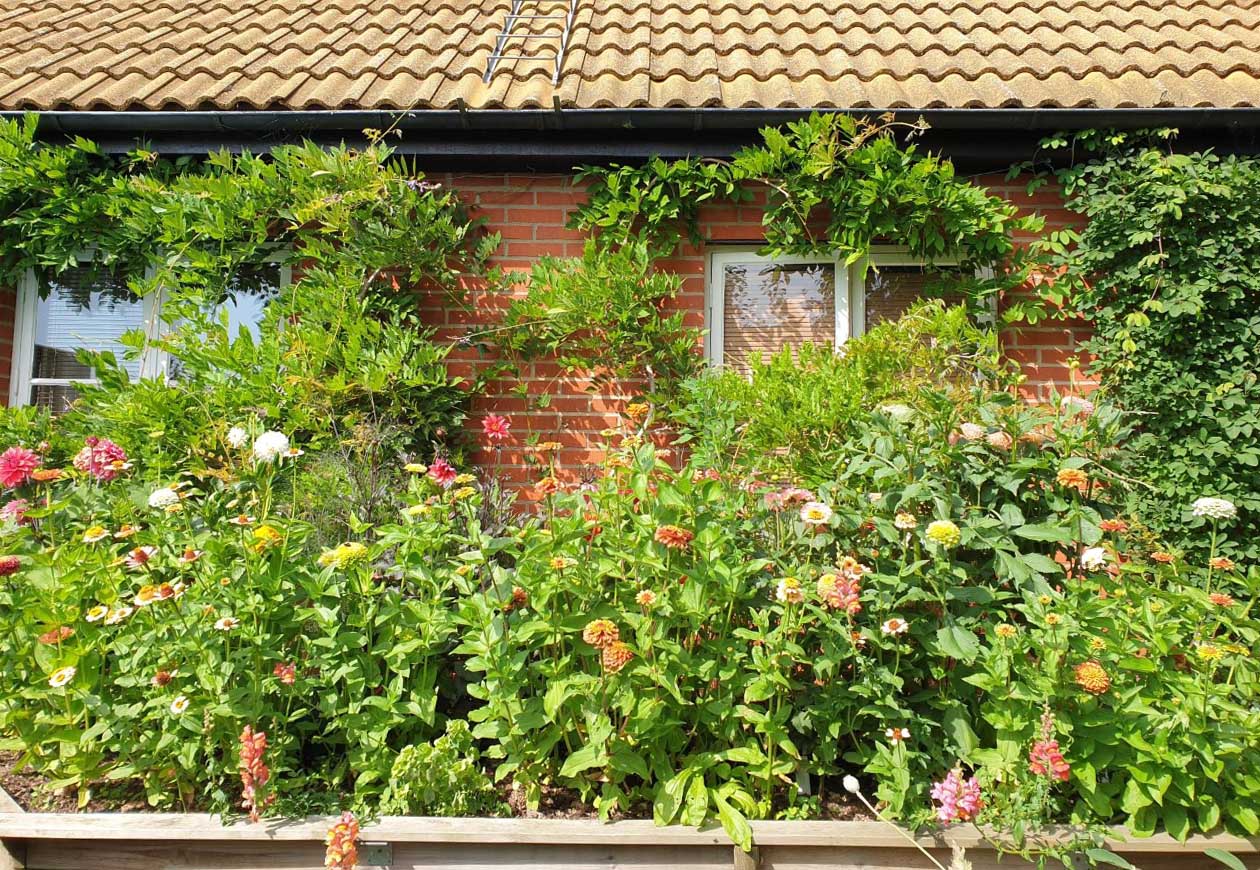 Alla sommarblommor är utplanterade i de upphöjda bäddarna och de första dahliorna och zinniorna blommar redan. Många perenner som vintersåddes är också omplanterade i enskilda krukor och i växthuset är det grönt och lummigt av tomater, chili och gurka.