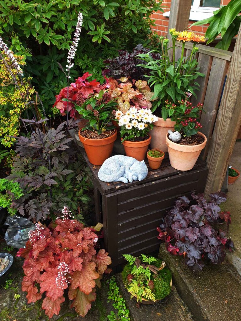 I Trädhörnet blommar sommarrudbeckian ‘Sahara’ och matchar den japanska lönnen ‘Chishio improved’. Minnesgoda bloggläsare kanske reagerar över lönnen – jodå, det var här storaxet, Styrax ‘Wespelaar’ planterades för två år sedan. Men trädet dog i de där minusgraderna i maj… 😦 Och eftersom det var mitt andra Styrax japonica att gå hädan just i en sen vårfrost så tog vi beslutet att ersätta den med något annat. Det blev en japansk lönn med otroligt vackra bladfärger (rödrosa på våren, gröntonad på sommaren och rödorange på hösten). Med tiden ska den bli ungefär fyra meter hög.