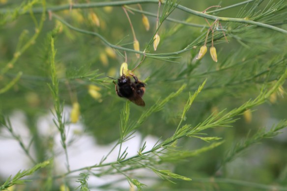 Sparrisen är färdigskördad för i år och nu får den växa upp i sällskap med blommande vallmo. På väggen syns fembladig akebia som klättrar på armeringsmattor och hjälper till att klä in en del av tegelväggen i grönska.