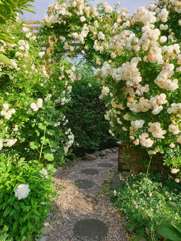 På andra sidan gången vid ingången ska glasbärsbusken flytta in (när jasmintry-trädet väl har grävts upp). Glasbärsbusken mådde inte bra under torkan sommaren 2022 och behöver få en mer skuggig placering där den också får mer fukt. Den vackra hängande japanska lönnen ‘Ryusen pendulum’ som också står där ska även den få flytta, den får nämligen inga höstfärger när den står i skuggan. Vi får se var jag kan hitta en bra plats till den… Det har jag ännu inte landat i. I nödfall får den bo i kruka ett år medan jag funderar.