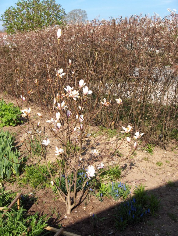2020, 19 år efter plantering ser den ut så här. Numera är den dryga fyra meter hög och än är den inte färdigvuxen. Jag har stammat upp den lite med åren. Blomningen är magnifik varje vår! Det blå under är pärlhyacinter som har samma ”vårklocka” som just praktmagnolia och alltid blommar samtidigt.