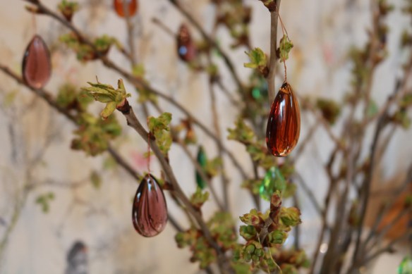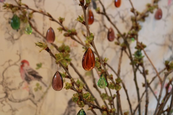 Med detta önskar jag er alla en riktigt fin påsk! Jag och två av barnen ska åka på besök till mamma medan maken håller ställningarna hemmavid (vi har ju en del husdjur som ska ha mat och tillsyn…). I år pryds kvistarna i köket inte av papegojfjädrar från våra husdjur, utan av de här vackra glasdropparna jag har köpt via en insta-vän. De kommer att kunna användas i många år och också glittra i ljuset andra delar av året än bara till påsk.