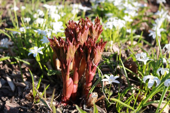 De röda pionknopparna är så snygga mot de vita vårstjärnorna.