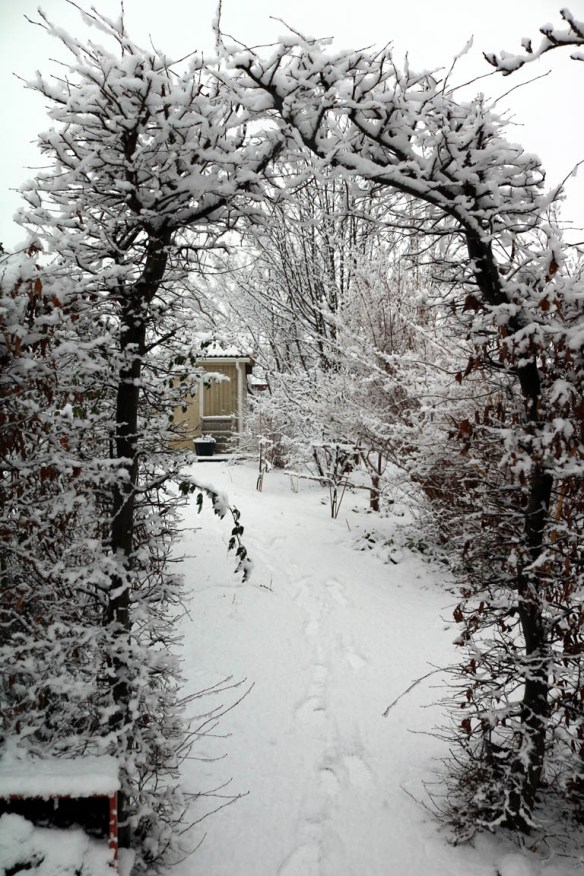 …och jag har flyttat våra tre spaljéäppleträd till våra upphöjda odlingslådor… De ska förhoppningsvis trivas bättre mot en varm tegelvägg i österläge än vad de har gjort i halvskuggigt västerläge i Trädhörnet.