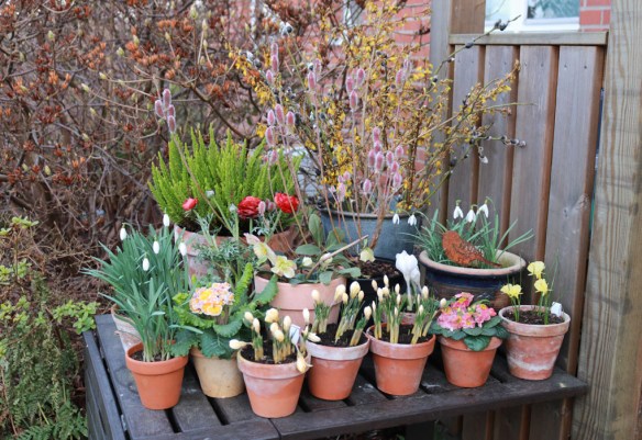 Nu trängs krukor med blommande daggtörel, gyllenlack, krokus, penséer, botaniska tulpaner, rosa pärlhyacinter och ranunkler med ett av höstens lökinköp, den vackra kejsarkronan ‘Early Fantasy’. Måste försöka få tag på fler lökar i höst!