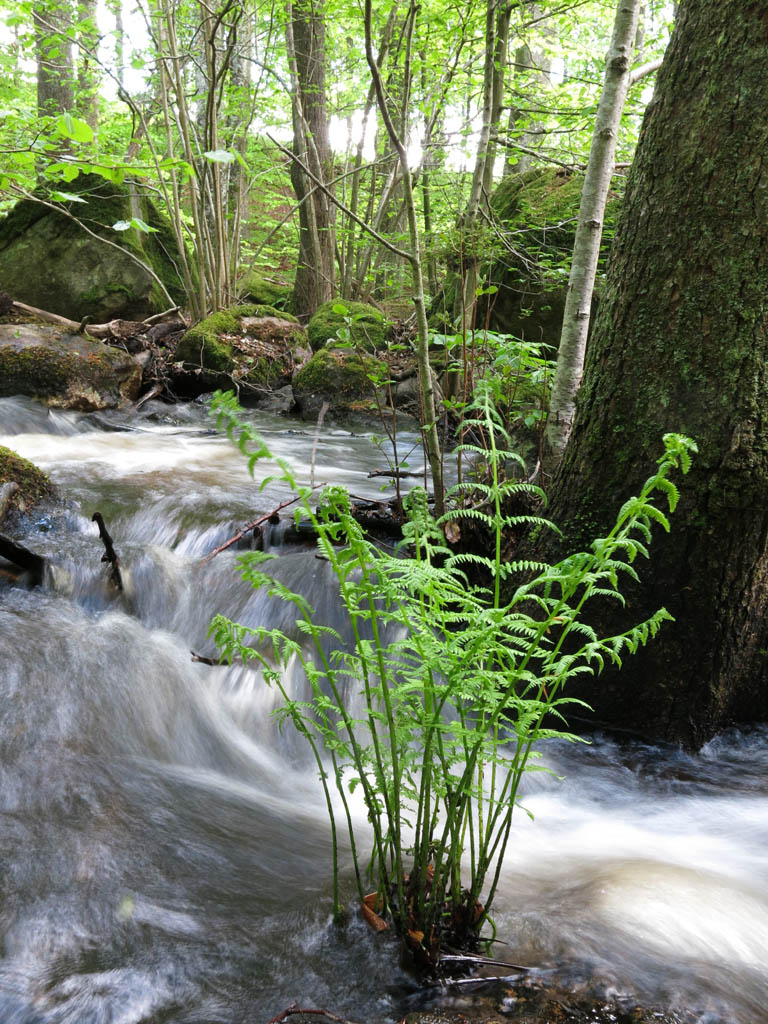 Vid sidan av bäckens smådammar finns både blötbäddar med rodgersia, olika ormbunkar, funkia och och annat fuktälskande som jag har svårt att ha på andra ställen i vår väldränerade trädgård. Jag gör bland annat ett nytt försök med solbrud som bara är ettårig hos oss på grund av att det blir för torrt.