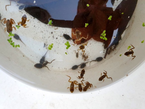 Blir det en längre tids torka har vi 600 liter regnvatten i tunnorna vid huset som kan hjälpa till att fylla upp dammen. Regnvattnet fyller upp dem först, sedan rinner överskottet vidare till dammen via ett rör som mynnar ut vid bäckens första lilla damm.